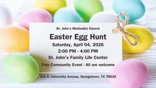 Bring the littles and all their friends to hunt for Easter Eggs at St. John's Methodist Church. There will be snacks, crafts, games, and photos. There will be story time telling the story of Jesus' resurrection and love for us. The Easter Egg Hunt will take place on the front lawn of the church.