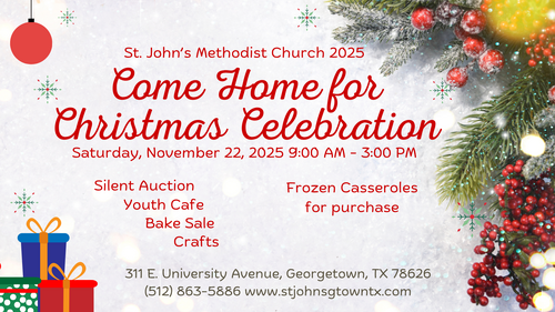 Join us on November 22nd for our Annual Come Home for Christmas Celebration. There will be a Youth Cafe, where all proceeds go to the St. John's Youth Ministry, that will have breakfast tacos and lunch items for sale along with waters, sodas, and teas. There is also a silent auction, crafts for you to decorate your home, and a bake sale that will have all your goodies for your Thanksgiving meal. We also have King Ranch Chicken Casserole and Chicken Spaghetti Casserole for sale.